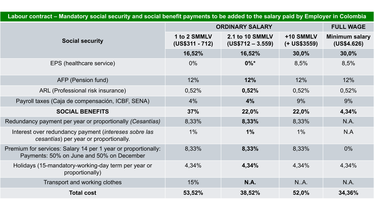 According to the Colombian Labour Law, employees are entitled to the following social security contributions and labour social benefits: