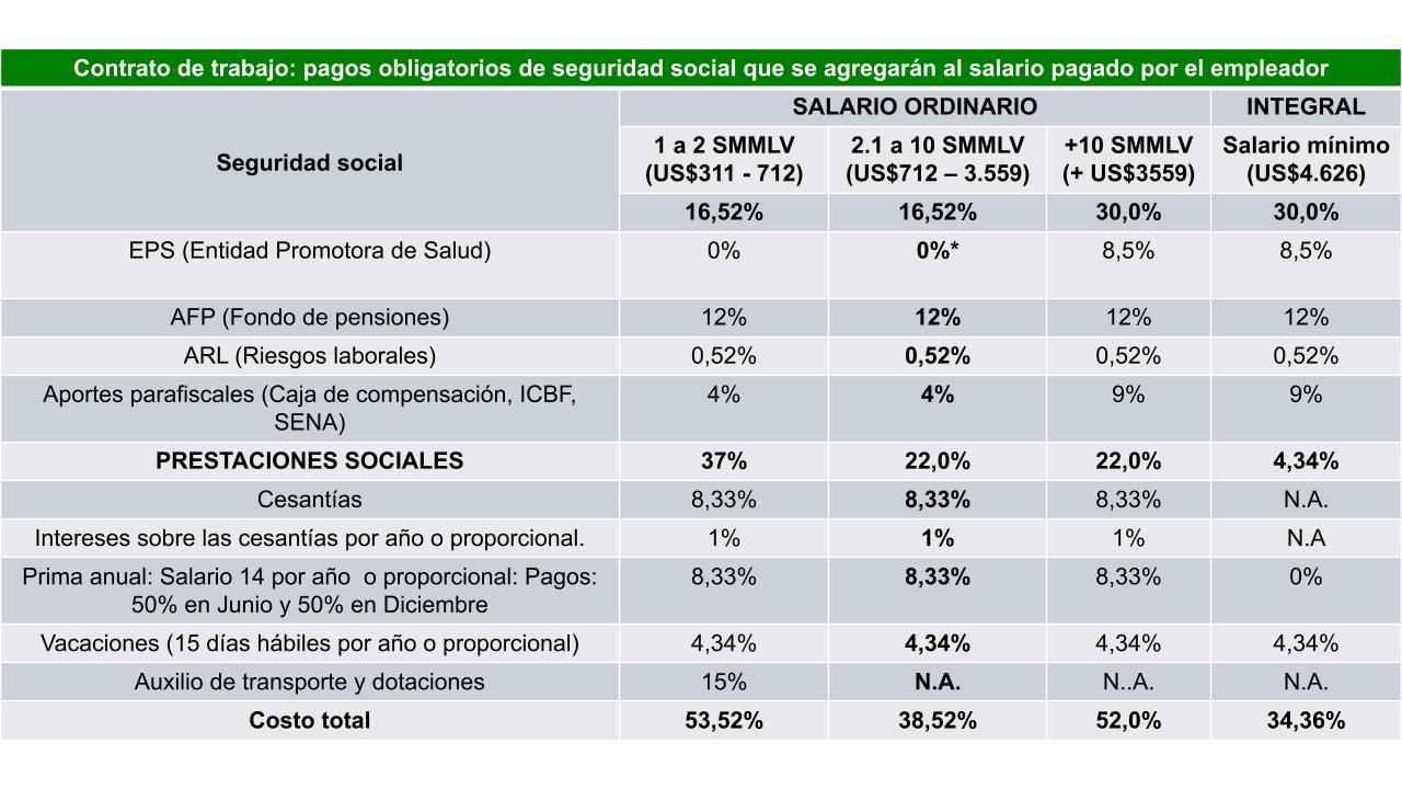 De acuerdo con la Ley Laboral colombiana, los empleados tienen derecho a las siguientes contribuciones a la seguridad social y beneficios sociales laborales: